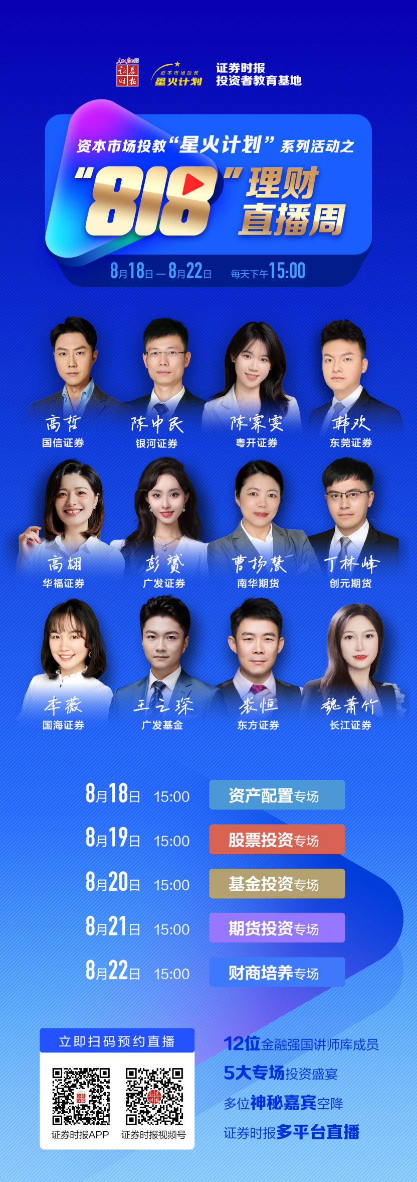 近期,A股持续向好,投资者在“布局机会”与“规避风险”间反复权衡;与此同时,“高收益理财陷阱”“虚假投资APP”等非正规金融活动仍在伺机而动。面对复杂多变的金融市场,如何穿透信息迷雾、把握真实机遇、筑牢风险防线日,由证券时报社主办、资本市场投教“星火计划”支持的“818理财直播周”即将重磅开启!每日15:00锁定证券时报官网、APP及视频号,12位头部金融机构资深金融讲师、五大专场,深度拆解市场热点,手把手教你从“盲目跟风”到“理性布局”,让投资更有方向、更有底气。